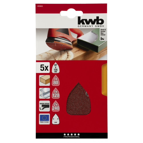 kwb Schuurdriehoeken, hout en metaal, edelkorund, 96 x 136 mm Quick stick -- Schuurdriehoeken, HOUT & METAAL, edelkorund, 96 x 136 mm, met aluminiumoxide bestrooid, gebonden met volledig synthetisch hars, versterkt dragermateriaal, met velours rug, geperforeerd, voor delta-/driehoekschuurmachines, voor het schuren van metaal, hout, verf, lak, plamuur, steen en kunststof.