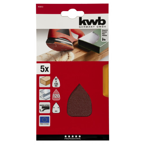 kwb Schuurdriehoeken, hout en metaal, edelkorund, 96 x 136 mm Quick stick -- Schuurdriehoeken, HOUT & METAAL, edelkorund, 96 x 136 mm, met aluminiumoxide bestrooid, gebonden met volledig synthetisch hars, versterkt dragermateriaal, met velours rug, geperforeerd, voor delta-/driehoekschuurmachines, voor het schuren van metaal, hout, verf, lak, plamuur, steen en kunststof.