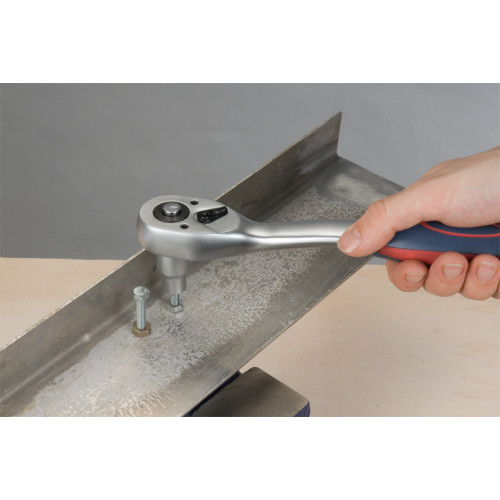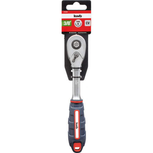 CV-staal, ratel, omschakelbaar links of rechts draaiend, mat verchroomd, kogelvergrendeling met drukknop, met slipvaste 2 componentengreep voor een optimale krachtoverdracht en meer comfort tijdens het werken
