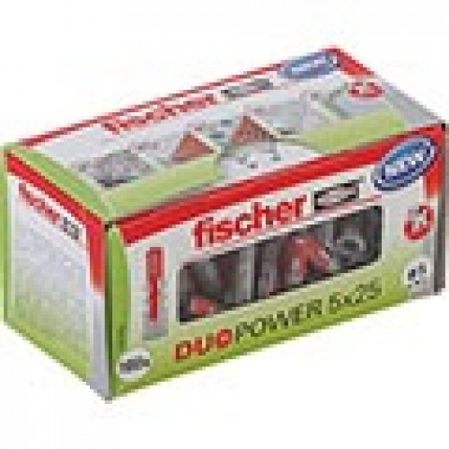 De fischer DuoPower heeft een zeer hoge bevestigingswaarde door de 2 componenten: de grijze component van kwalitatief hoogwaardig nylon activeert, afhankelijk van het bouwmateriaal, automatisch het optimale werkingsprincipe (spreiden, vouwen, knopen) voor het optimaal houvast. De expansievleugels van de rode component ondersteunen de betrouwbare spreiding en biedt extra veiligheid voor de grijze component. De schroef indraaien en tot slot goed �aantrekken�. De bij de kop aangebrachte rand voorkomt dat de plug in het boorgat glijdt.