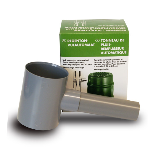 Vulautomaat van grijs PVC die te gebruiken is op alle soorten regentonnen. Deze vulautomaat wordt geplaatst tussen de regenpijp (diameter 70 tot 80 mm) en heeft een overloop functie. Het water uit de regenpijp vult dan de regenton.