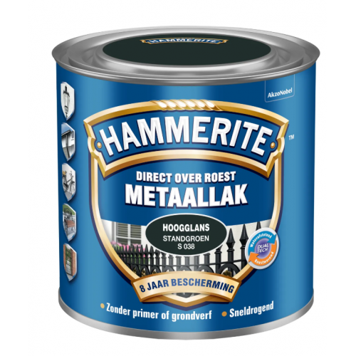 Hammerite Metaallak Hoogglans is een decoratieve roestwerende metaallak voor alle soorten ferro metalen, zowel nieuw als roestig en beschadigd. Deze metaallak kan direct over roest aangebracht worden, er is dus geen grondverf meer nodig. Dit product is kras- en stootvast, stopt het roestproces en geeft 8 jaar bescherming tegen roest. Hammerite Metaallak Hoogglans is waterafstotend en weerbestendig waardoor het goed gebruikt kan worden voor de bescherming van allerlei metalen objecten in en om het huis.
