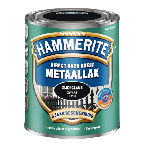 Hammerite Direct over Roest metaallak zijdeglans zwart 750 ml is een decoratieve, roestwerende metaallak voor alle soorten (roestig en beschadigd) metaal. Je kunt het zonder primer of grondverf direct over roest aanbrengen. Je hoeft dus niet urenlang te schuren of te ontroesten want Hammerite metaallak hecht uitstekend. Het stopt het roestproces en geeft maar liefst 8 jaar roestbescherming. Hammerite metaallak is waterafstotend en weerbestendig waardoor je het goed kunt gebruiken worden voor de bescherming van allerlei metalen objecten buiten. Hammerite metaallak is in diverse kleuren leverbaar en is UV-bestendig waardoor het metaal langdurig verfraait.